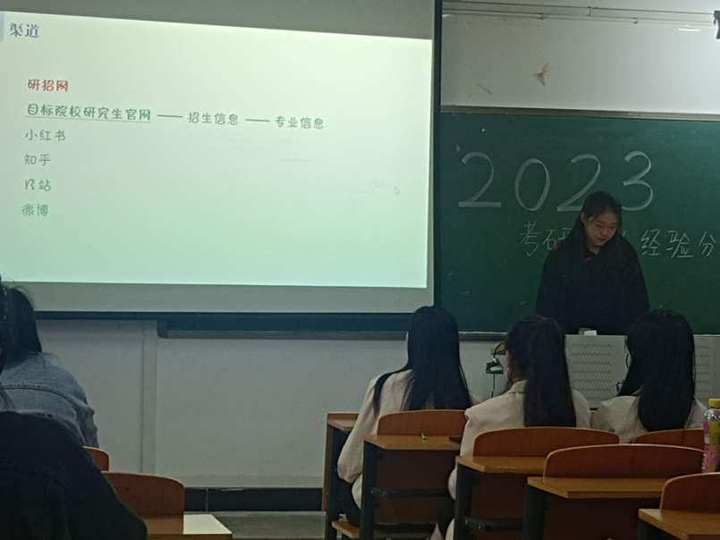 在2023年硕士研究生考研中已被录取的学生代表进行了经验分享交流。分享活动中,被景德镇陶瓷大学录取的2019级美术学专业的蔡杰同学从英语、政治、专业课三个学科为同学们介绍了自己的经验;被贵州师范大学录取的2019级美术学专业的王楠楠同学强调了考研院校的选择和考研中毅力的重要性,她表示在考研过程中选择和努力同等重要,并鼓励同学要坚定考研信念,树立信心;被广西师范大学录取的2019级美术学专业的肖海霞同学她分享了自己的考研过程中的日常安排,从自身经历上总结出方法,认为良好的心态是考研成功的胜利关键;被信阳师范学院录取的2019级美术学专业的张殿荣同学针对考研专业课的书籍选择上进行分享,并向大家推荐了一些在考研过程中对同学们十分实用的书籍资料;被兰州理工大学录取的2019级视觉传达设计专业的宋柯颖同学,她分享了自身考研调剂成功的经历,重点介绍了考研调剂院校的选择和调剂过程中要注意的事项,鼓励同学们“无论遇到什么困难,不要轻易言弃”。