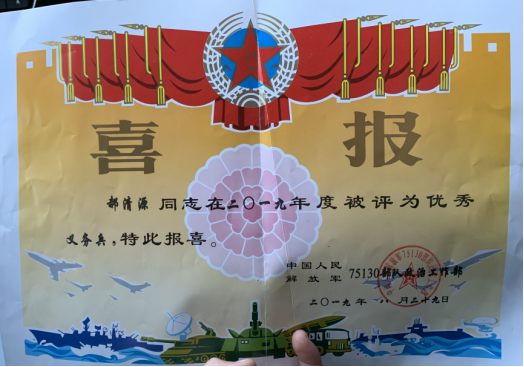 两年以来在完成每天训练任务的同时,为了能让成绩尽快提高,经常能看到他加班训练的身影,晚上站夜哨的时候他还会给自己加练……一次次的挑战和突破,所有努力都没白费。最终,郝清源以突出的训练成绩被评为“优秀士兵”。