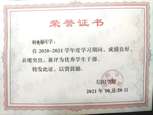 两年的部队锤炼,让他得到了很大提升。在大学这个丰富多彩的地方,他不仅好好学习,而且在学习之余参加各种活动,充分发挥他自己的才能。他一直都要求自己尽职敬业,做事认真负责,把工作做好。在担任班级班长期间,老师每次留下的任务,他都努力认真地完成,从不拖泥带水,全心全意为各科老师分忧解难,协助其他班干部为班级服务,得到了老师和同学的一致好评。