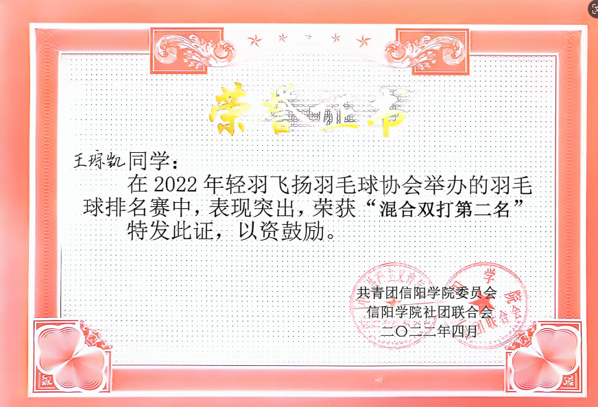 老话说“身体是革命的本钱”,王琮凯同学在平时不断加强体育运动课余时间,并参加校羽毛球队,代表学校参加比赛,并取得河南省大学生运动会羽毛球比赛河南省第六名的成绩。