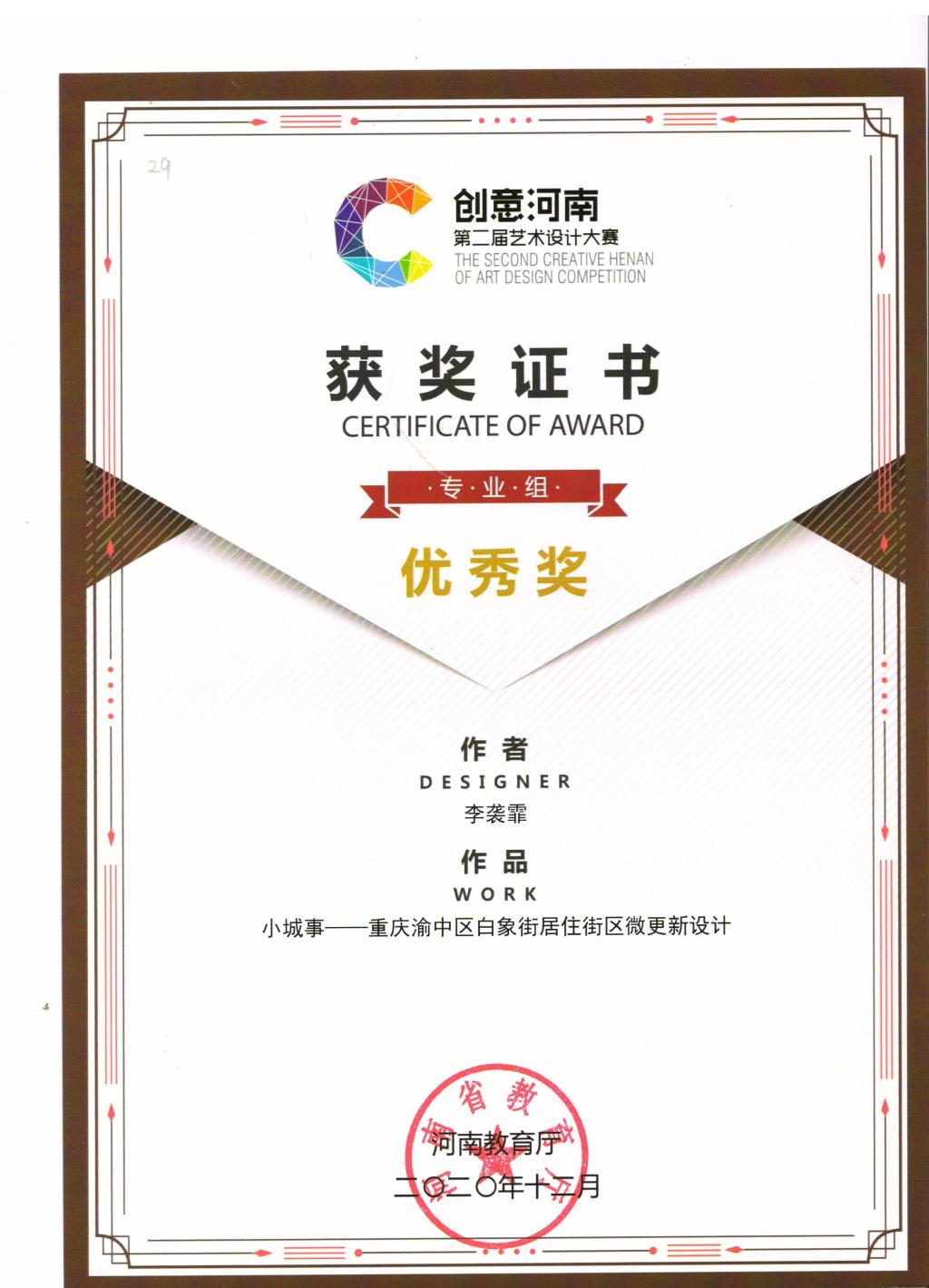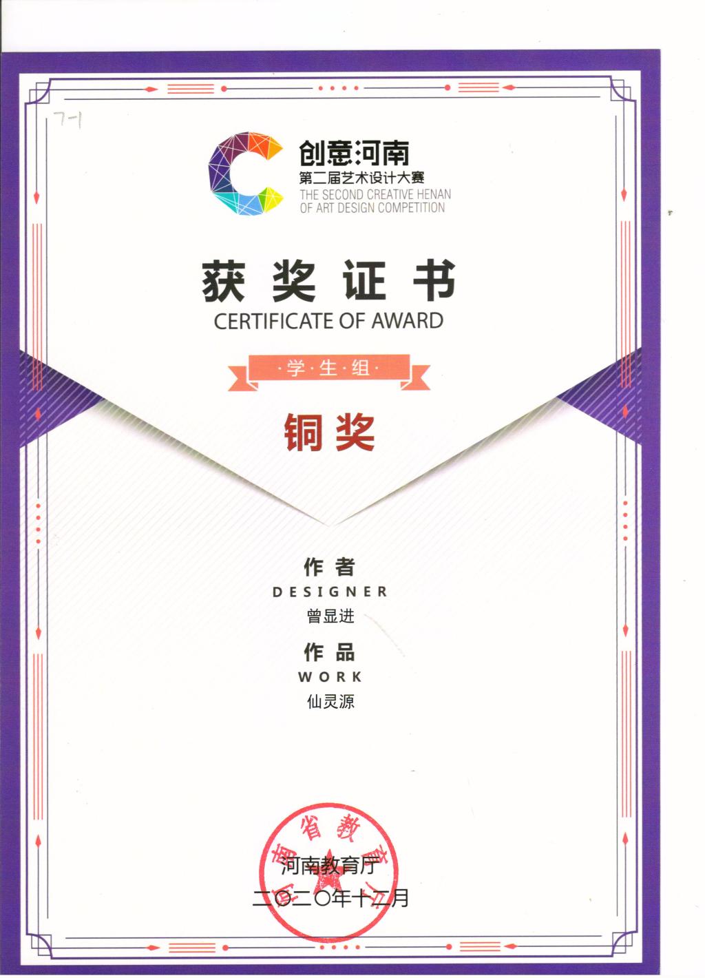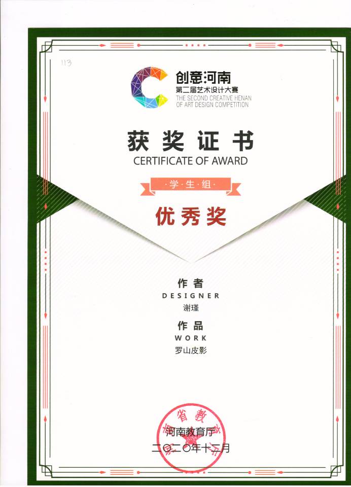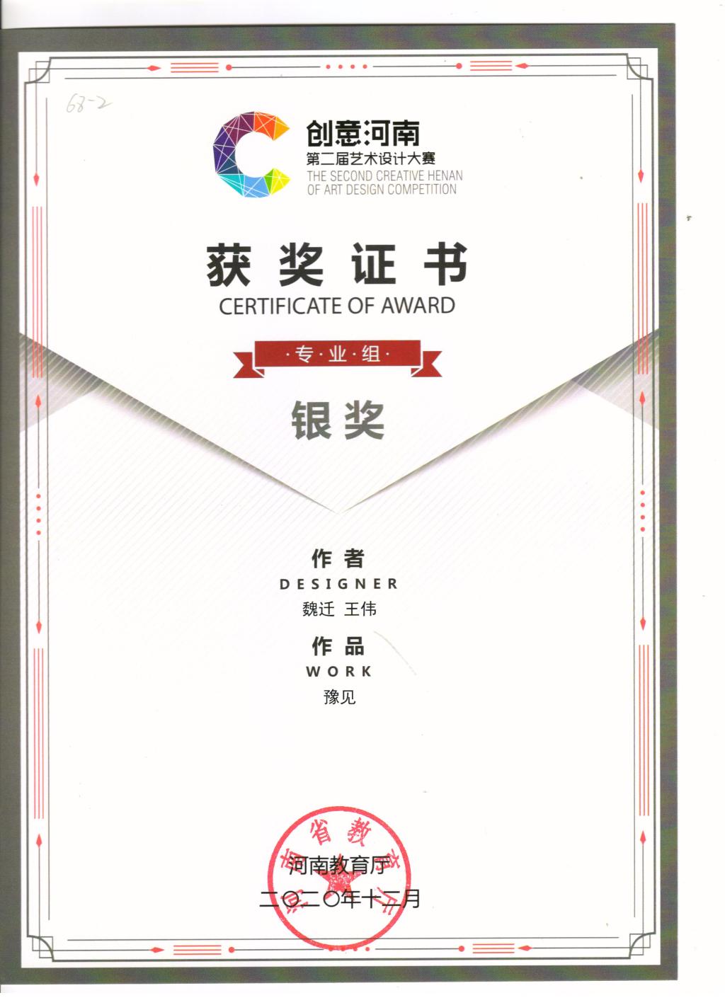 近日,由河南省教育厅主办,河南省学校艺术教育协会、郑州轻工业大学易斯顿国际美术学院、黄河科技学院承办,河南省工艺美术职业教育集团、河南安行文化发展有限公司、大河美术报、河南文化网等单位协办的第二届“创意河南”主题作品艺术设计大赛获奖结果揭晓。我院师生喜获3项金奖、2项银奖、4项铜奖、2项优秀奖。在专业组中,周连峰作品《稚趣童年》、王明月作品《豫剧人物》获得“金奖”;魏迁、王伟作品《豫见》,郑满意、王伟作品《信阳南湾渔乐》餐饮标志获得“银奖”;苏家兵作品《防沙护土,守护蓝天》,宋梦如、石留洋作品《倾城设计事务所》获得“铜奖”;李袭霏作品《小城事—重庆渝中区白象街居住街区微更新设计》获得“优秀奖”。在学生组中,张少婵作品《信阳“闷罐肉”包装设计》获得“金奖”;曾显进作品《仙灵源》、刘春焕作品《“火域”商丘城市形象设计》获得“铜奖”;谢瑾作品《罗山皮影》获得“优秀奖”;我校获得“优秀组织奖”。