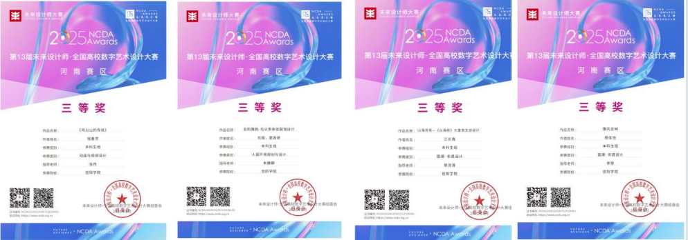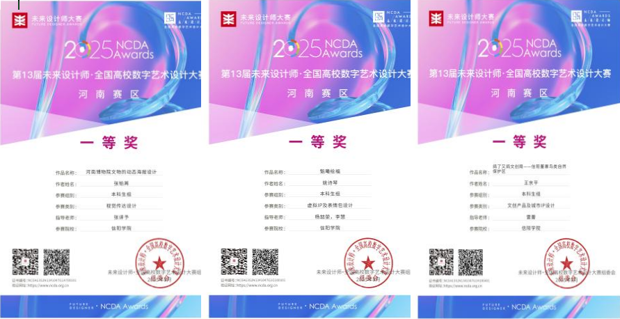 近日,第13届未来设计师·全国高校数字艺术设计大赛(NCDA)圆满落幕。美术与设计学院师生经过省赛、国赛的激烈角逐,凭借出色的专业能力和创新思维,最终从众多参赛院校中脱颖而出,共获19项大奖。其中全国总决赛一等奖1项、三等奖1项,河南赛区一等奖3项、二等奖3项,三等奖4项,优秀指导教师7项。