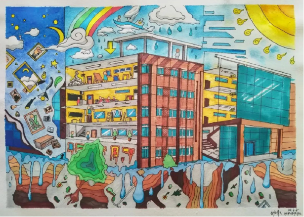作品说明:用线条来创作教学楼某一部分的内、外部结构,灰色的深浅程度表现距离的远近,加了少量的颜色使画面更丰富。