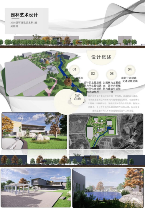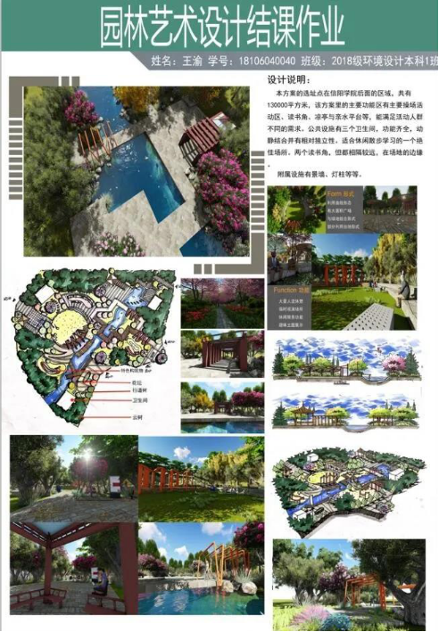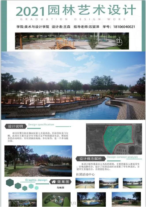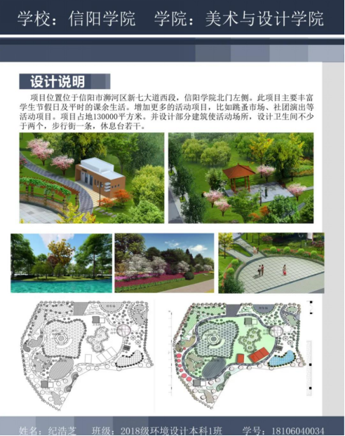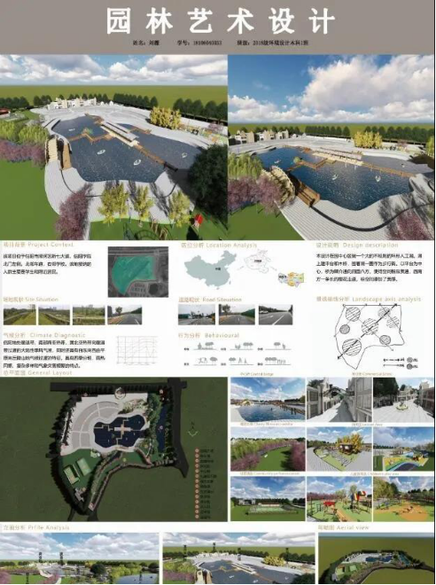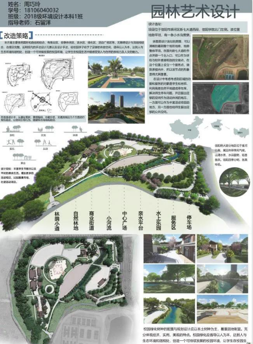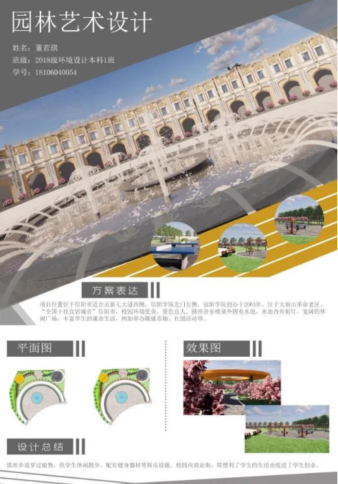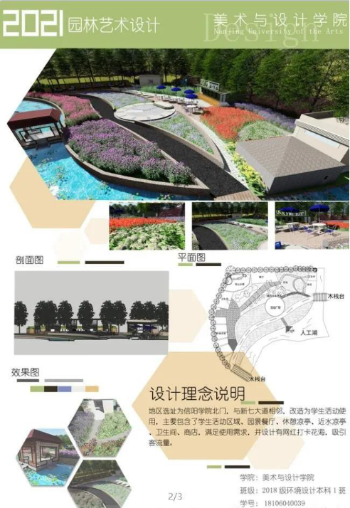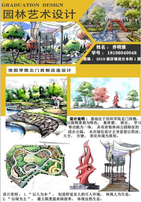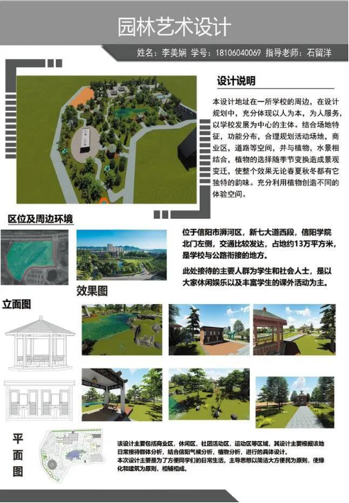 信阳学院美术与设计学院2018级环境设计本科1班的同学在园林艺术设计中展现了自己的风格。园林艺术设计是一种依照美的规律来改造、改善或创造园林环境,使之更自然、更美丽、更符合时代与社会审美要求的艺术创造活动。园林不单纯是一种艺术形象,还是一种物质环境,园林艺术是对环境加以艺术处理的理论与技巧,它是与功能相结合的艺术,是有生命的艺术,是与科学相结合的艺术,是融汇多种艺术于一体的综合艺术。本次结课作业是对于信阳学院北门空地进行设计。