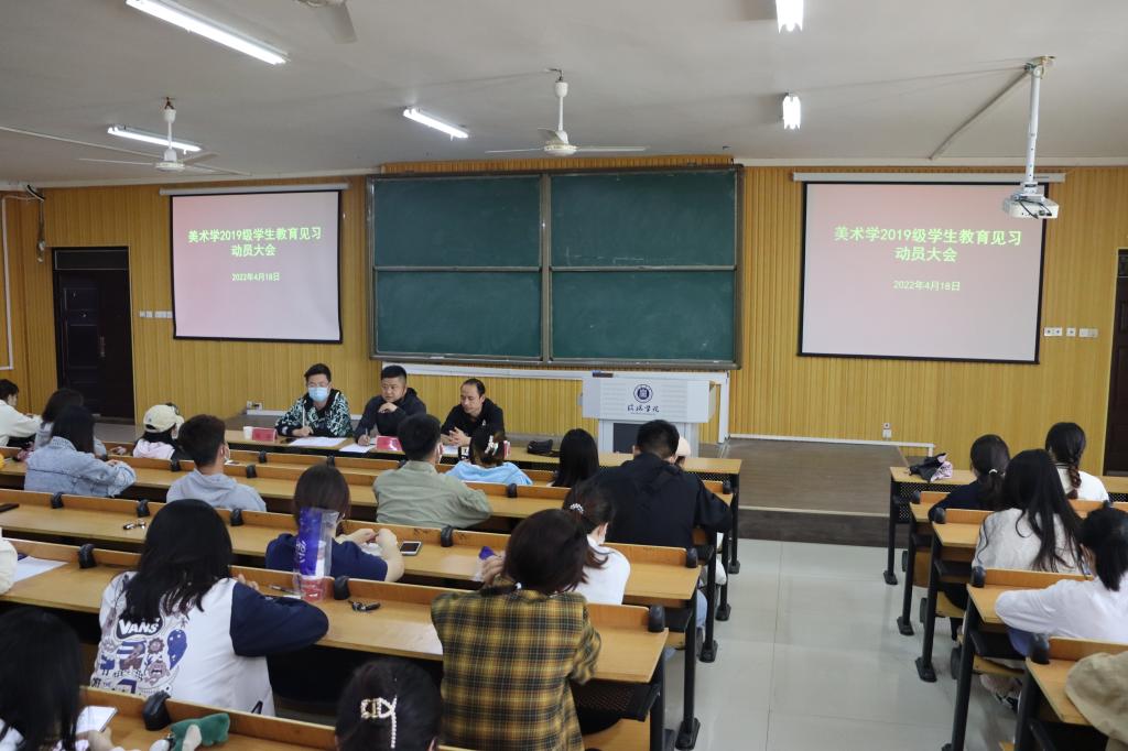 为全面实施人才培养方案,提升实践教学质量,做好2022年教育见习工作。4月18日中午,学院在艺术楼101室召开美术学专业2019级学生教育见习动员大会。学院副院长王伟、美术学教研室主任项军、相关工作负责人周扬、李明明,美术学2019级全体学生参加了本次会议。会议由项军主持。因学校疫情防控要求,本次会议设置第二分会场艺术楼407室,分会场以部分学生集中观看第一会场会议直播的形式召开会议,分会场由李明明主持。
