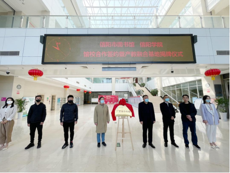 4月6日,我校与信阳市图书馆产教融合签约仪式在信阳市图书馆举行。信阳市文化广电和旅游局副局长胡宝强、信阳市文化广电和旅游局公共服务科科长刘义俊、信阳市图书馆馆长朱进、信阳市图书馆副馆长李达冉、信阳学院美术与设计学院院长张瑞瑞、教学副院长王伟出席仪式。美术与设计学院视觉传达设计教研室主任何伟以及部分教师代表参加了签约仪式。