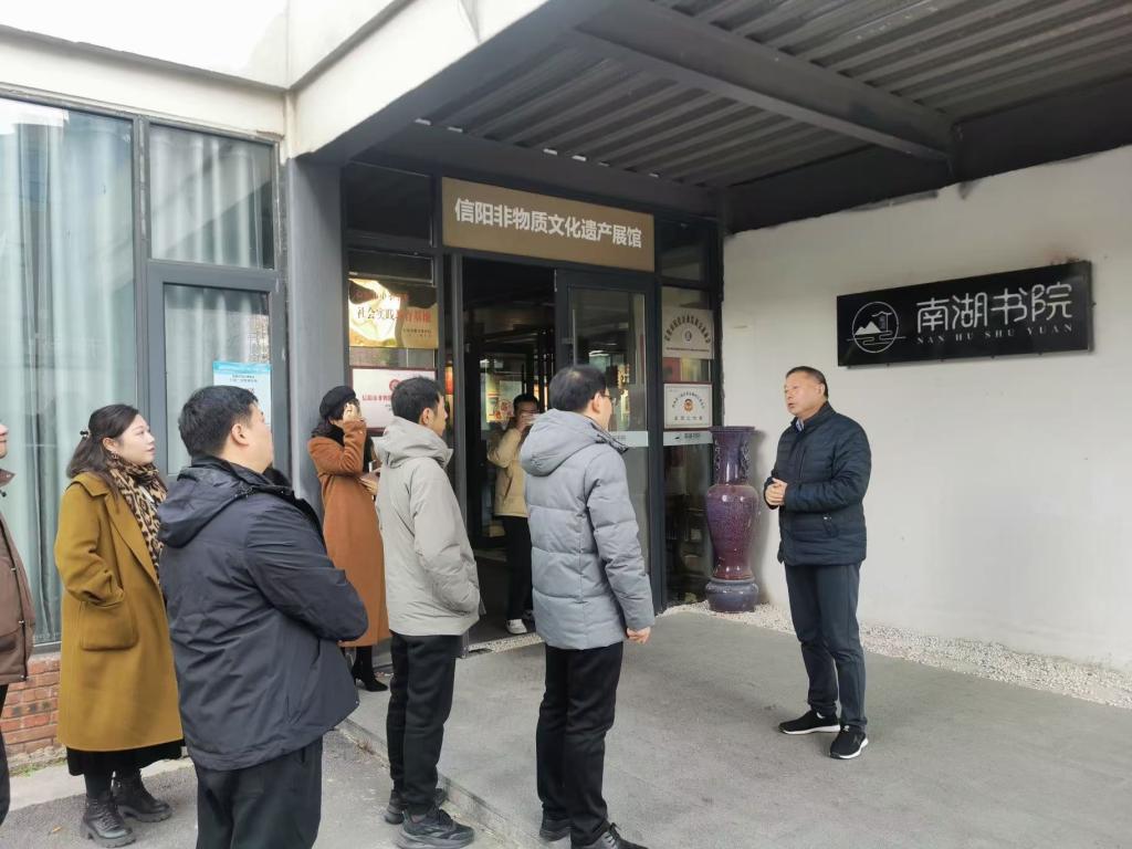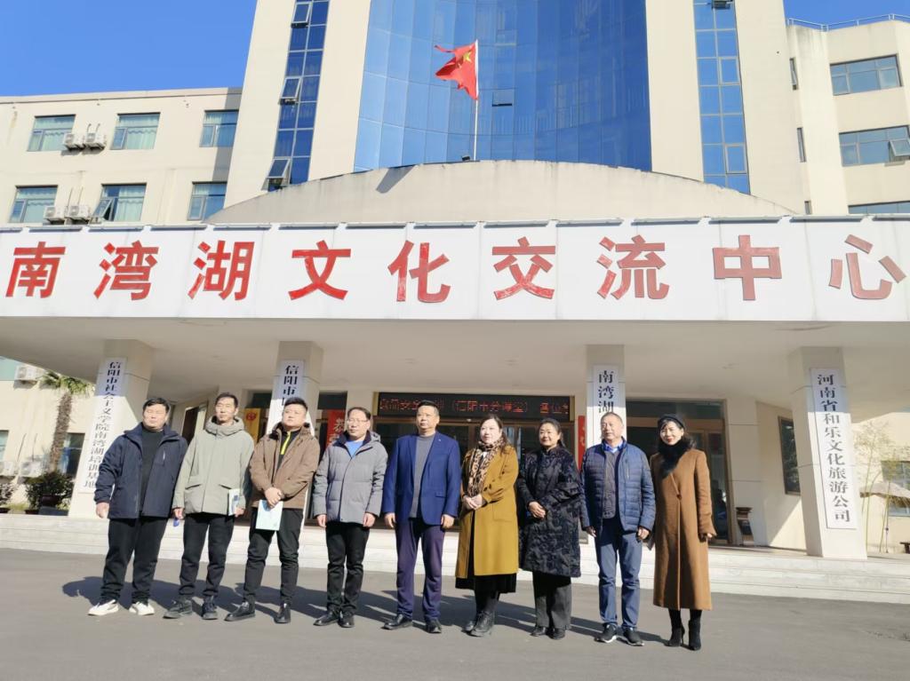 为了进一步加强与信阳市企事业单位的联系,拓展毕业生就业岗位,促进校企深度合作,共同推动信阳市文化旅游产业的发展,12月16日上午,美术与设计学院党总支书记郑山峰、教学副院长王伟、视觉传达设计主任何伟、环境设计主任张骁前往南湖书院(河南省和乐文化旅游公司)“访企拓岗”暨校企合作交流活动。浉河区文化广电和旅游局党组成员丛林薇参加调研。信阳市民企商会主席杨乐、南湖书院院长廖家宽热情接了一行人员。