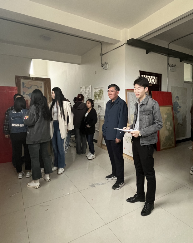 本次检查分为国画和油画两个组,主要检查学生们创作作品的进度和质量,同时也对学生作品进行具体指导。每到一处作品前,指导教师们围绕创作主题、造型刻画、画面效果、色彩关系、材料技法等内容提出修改意见。