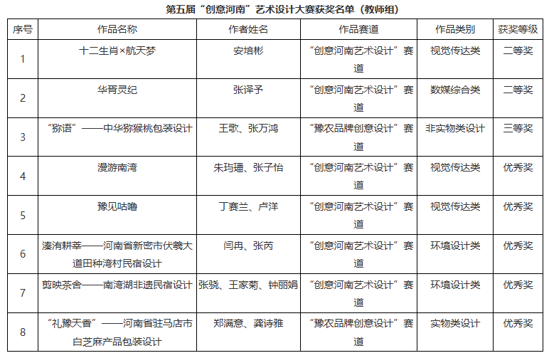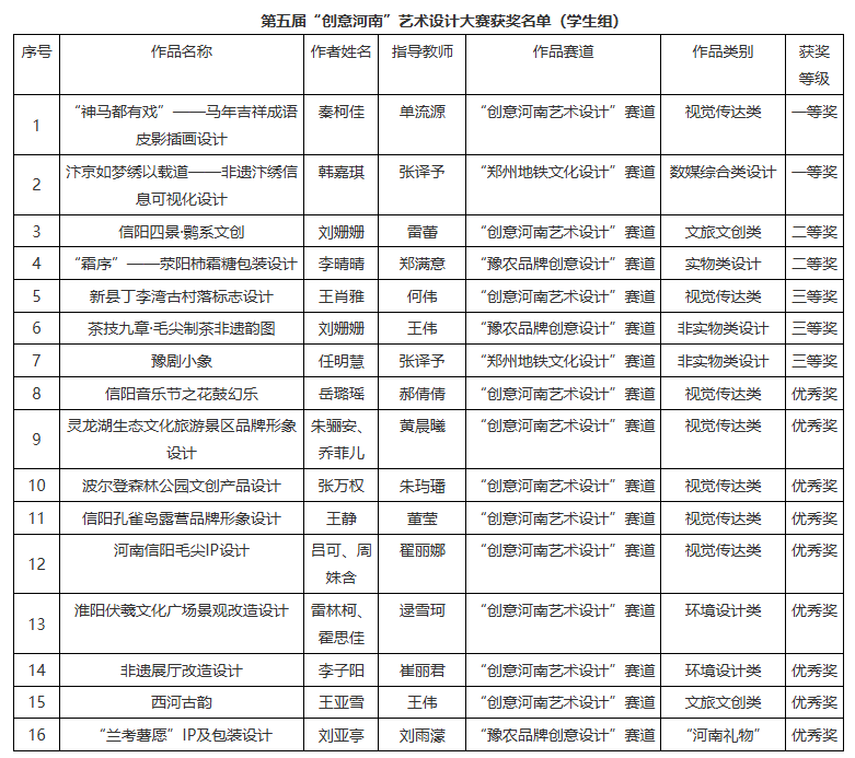 近日,河南省教育厅发布了《关于公布全省高等学校第五届“创意河南”艺术设计大赛评奖结果的通知》(教办体卫艺〔2026〕4号),我校荣获一等奖2项、二等奖4项、三等奖4项以及优秀奖14项,总计24项获奖作品。其中,教师组获奖8项,学生组获奖16项。