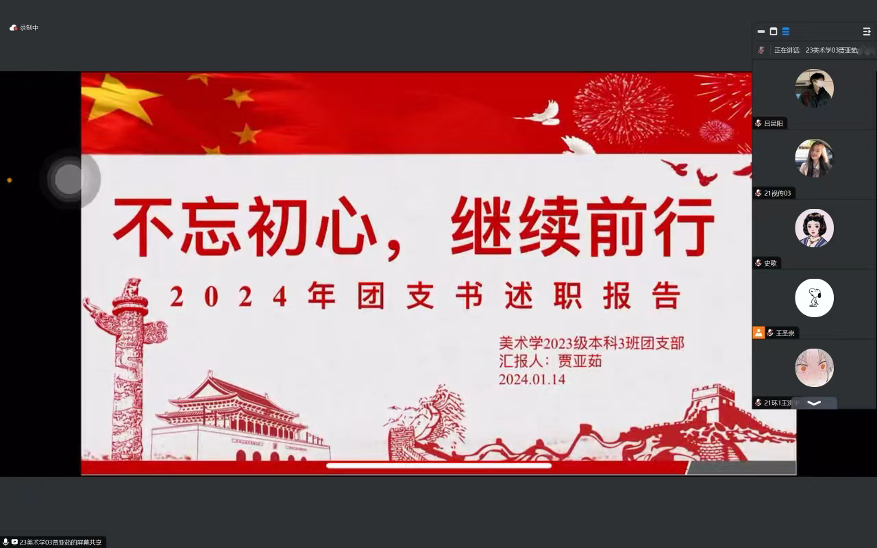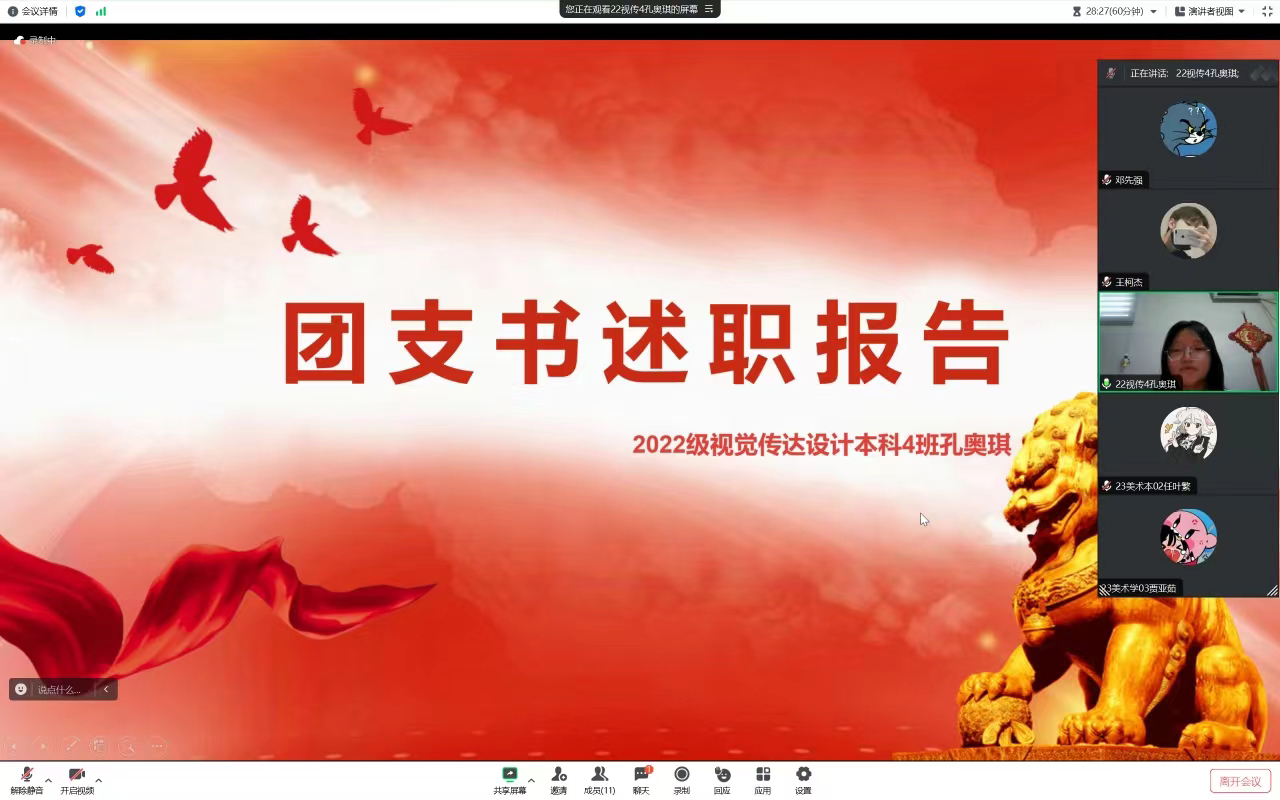 为进一步激发我院基层团总支活力,切实抓好团干部队伍建设,增强我院团组织的凝聚力和执行力,美术与设计学院于1月18日下午召开线上团支书述职评议会议,学院团总支书记邓先强及各班团支书参加了此次会议,会议由团总支副书记史歌主持。