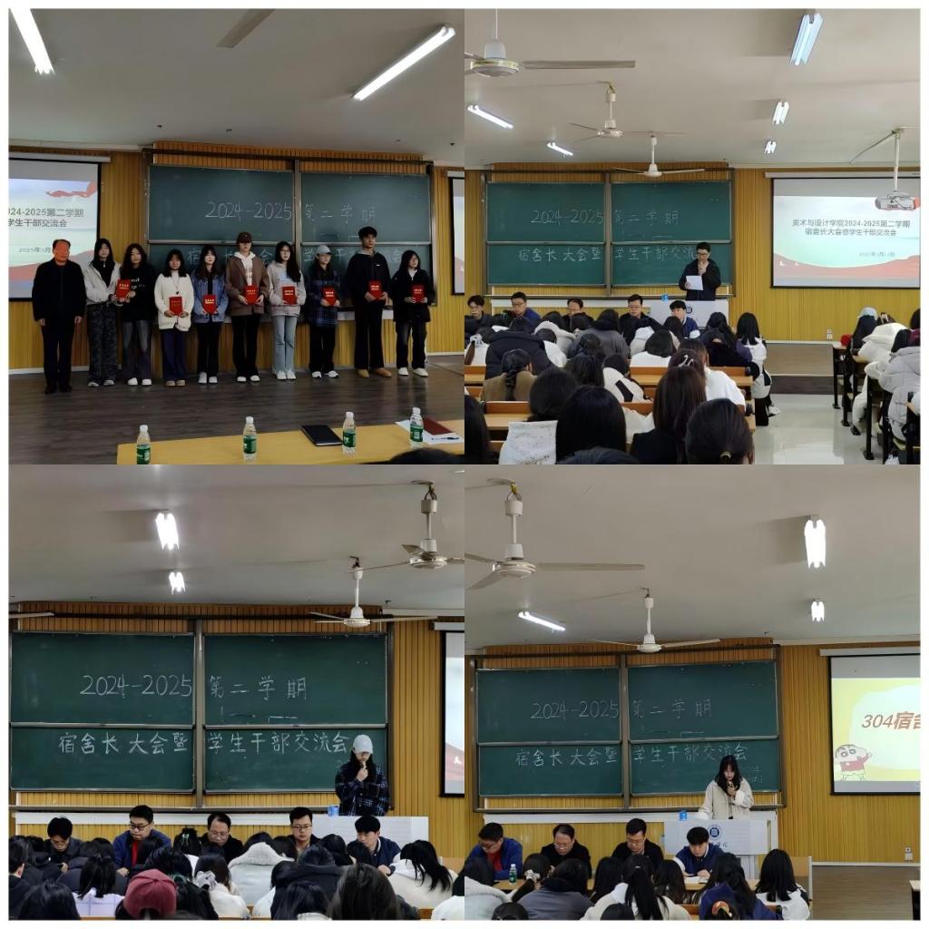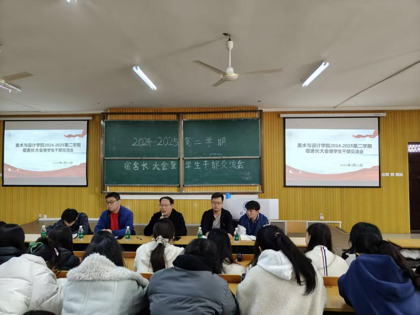 为加强学生宿舍管理,营造良好的宿舍环境,3月12日中午美术与设计学院在艺术楼101教室召开2024-2025学年第二学期宿舍长大会暨学生干部交流会。学院党总支书记郑山峰、学工干事秦金峰、全体辅导员老师、楼层长和宿舍长参加了本次会议。会议由辅导员余浩主持。