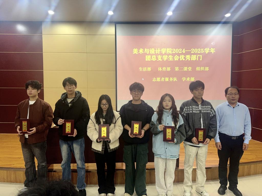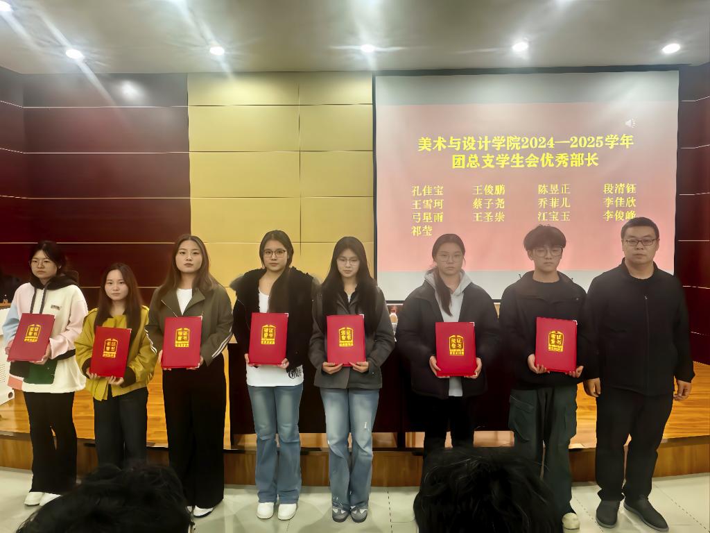 在表彰环节,邓先强宣读了《关于表彰美术与设计学院2024-2025学年团总支、学生会优秀干事、优秀部长和优秀部门的决定》。郑山峰、秦金峰、邓先强等分别为获奖代表颁奖,并为新一届学生干部颁发了聘书。