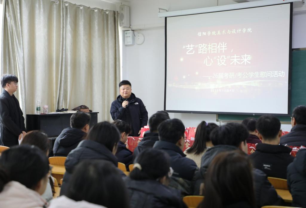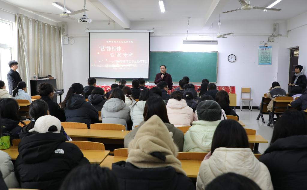 为助力毕业生考研、考公备考,缓解备考压力,12月4日上午,美术与设计学院“‘艺’路相伴,心‘设’未来”2026 届毕业生考研、考公指导慰问活动在艺术楼206教室顺利举行。学院党总支书记郑山峰、教学副院长王伟、教研室主任、毕业班辅导员及 2026 届考研、考公毕业生共同参加了活动。