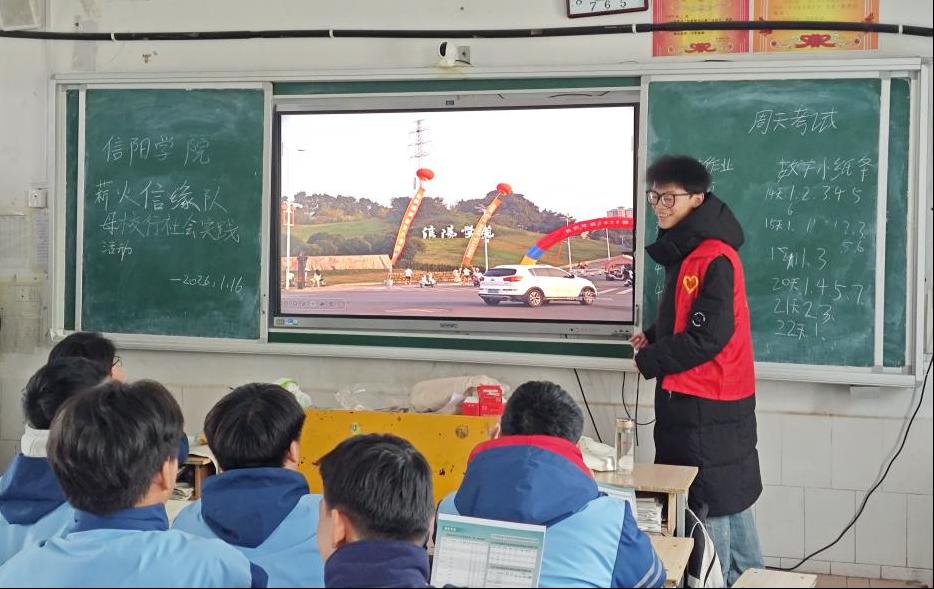 薪火信缘队唐正、曹郡、张冉刘、俞汶四位队员重返清丰育才学校,开展“感恩母校、助力高考” 主题社会实践活动。团队精心制作学院风采素材,以“从育才到信院” 为线索,结合亲身经历分享高中学习心得与备考经验。通过播放信阳学院校园光影纪实视频,详细介绍学校发展历程、专业设置、校园文化,重点展示了在大学习得的美术专业技能。活动采用“主题宣讲+互动交流+问卷调查”的形式,不仅为学弟学妹们高考助力,也为学校人才培养提供了真实依据。