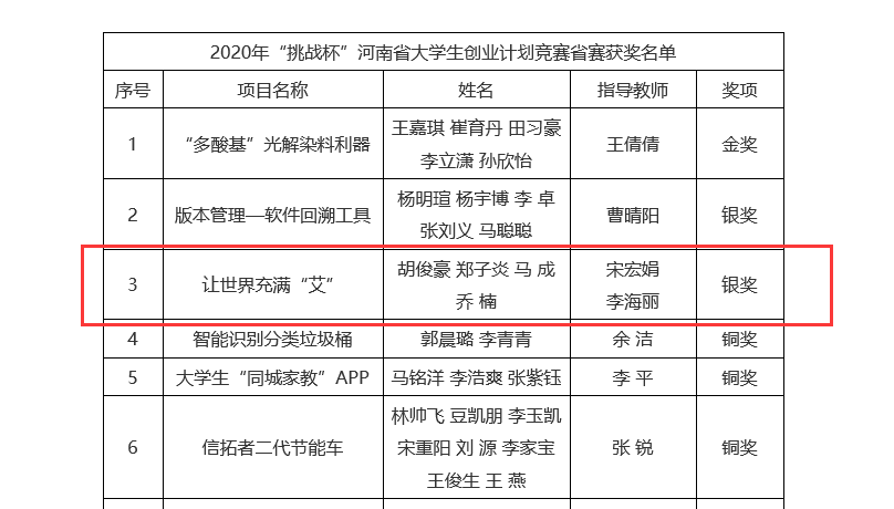 近日,由共青团河南省委、河南省教育厅、河南省科学技术协会、河南省学生联合会共同举办的2020年“挑战杯”河南省大学生创业计划竞赛获奖名单公布。我学生团队胡俊豪等人的参赛项目《让世界充满“艾”》获得“银奖”。