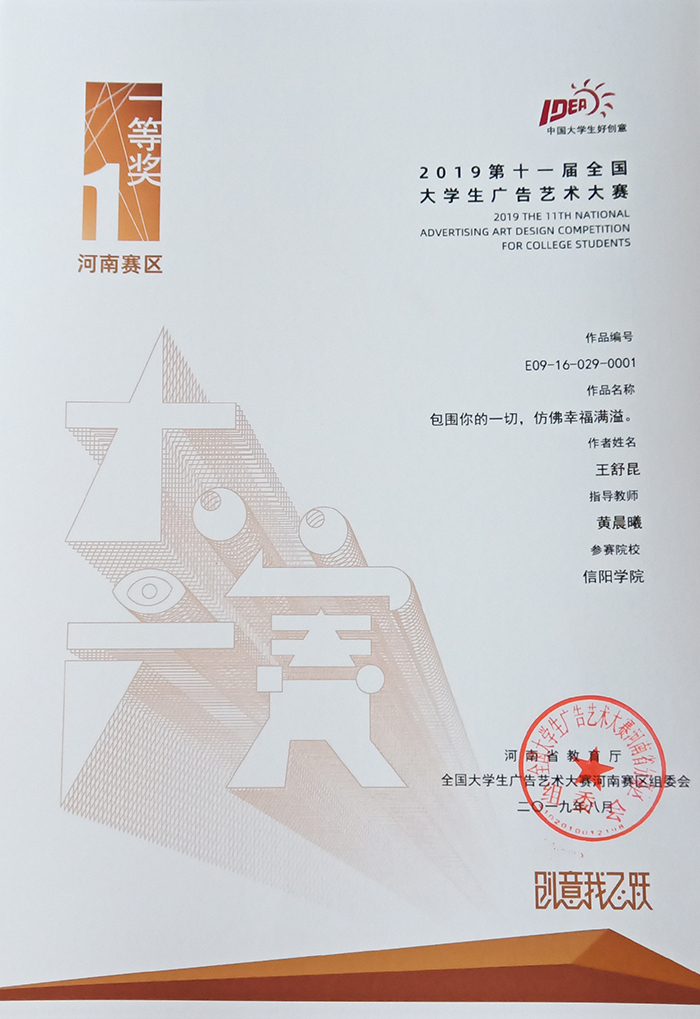 近日,第十一届全国大学生广告艺术大赛河南赛区结果出炉,我院师生作品获得一等奖1项,二等奖1项,三等奖2项,优秀奖15项,优秀指导教师6项。