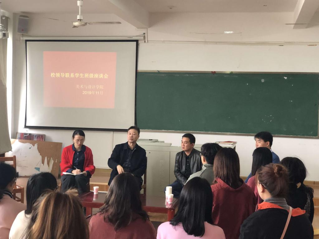 11月5日下午,副校长王志华深入美术与设计学院联系班级开展调研座谈。座谈会在艺术楼415教室举行,学生处处长余婷婷、美术与设计学院党总支副书记袁军、团总支书记刘加宽及2018级视觉传达设计本科1班全体同学参加了此次座谈会。