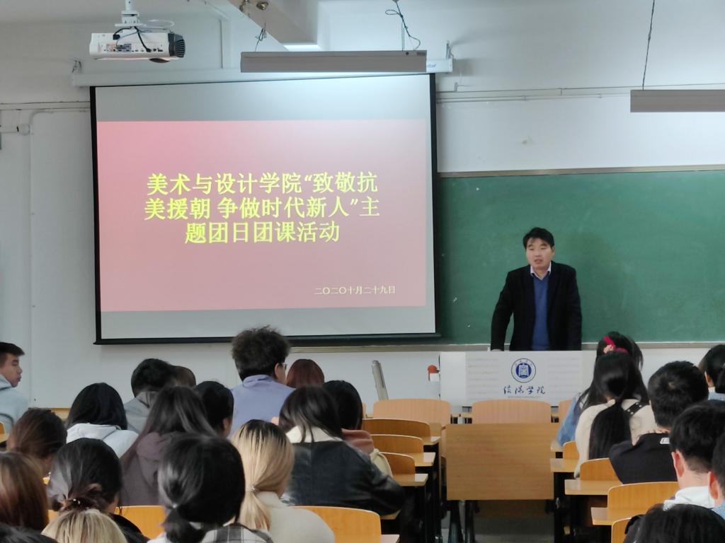 10月29日中午,美术与设计学院团总支在艺术楼407室,开展“致敬抗美援朝 争做时代新人”主题团课活动。2020级各班团支书、学院120名团员代表参加了此次学习活动。学院团总支书记刘加宽作为此次主题团课的主讲。