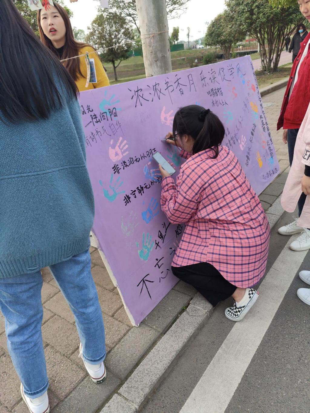 4月17日至18日,学院在西区田径场设置活动点,将前期学院收集学生参与活动时手工制作的精美书签进行统一展示,得到了路过学生们的驻足欣赏,这不仅激发了学生们对珍惜书籍、收藏好书的积极性,也增强了学生们的动手能力和制作能力,得到了学生们的一致好评和积极参与。