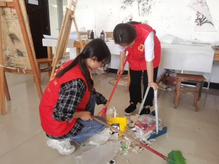 本次志愿服务活动主要围绕学院专业学习器材摆放较多的画室、工作室,尤其对毕业班教室进行集中打扫和清理。志愿者们分组协作、认真打扫,在数小时努力下,各个教室、画室变得整洁起来。活动结束后,服务队成员们在楼前合影留念。