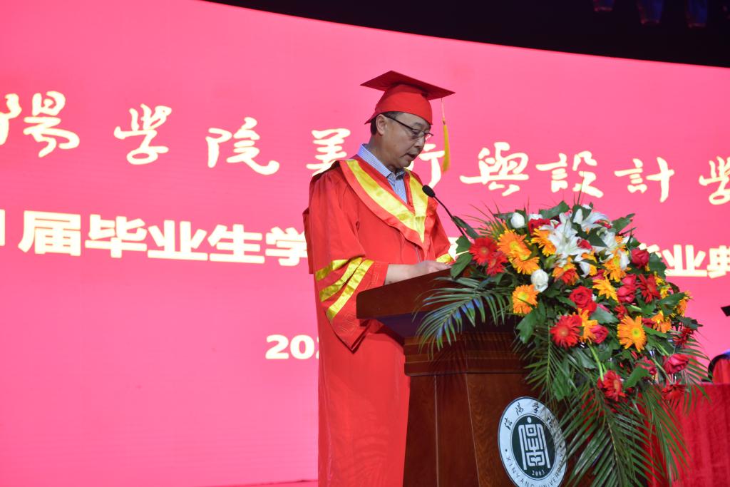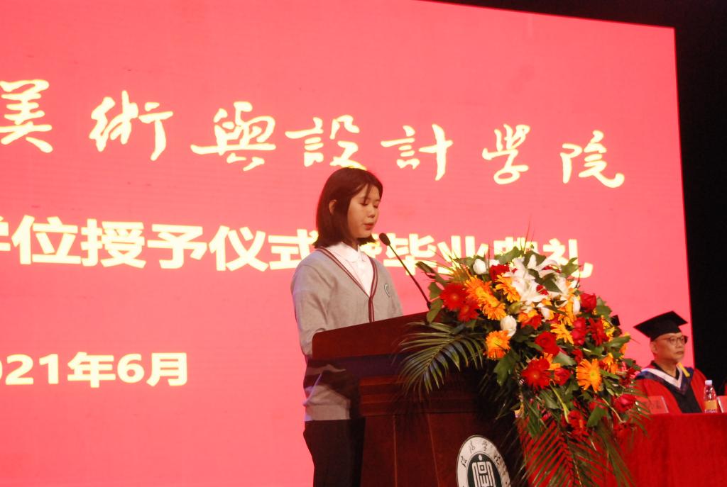 张瑞瑞做了题为“坚定不移跟党走,争做出彩美院人”院长寄语。她代表学院向全体顺利毕业的2021届毕业生表示衷心的祝贺,对老师们、家长们的悉心培育表示感谢。寄语中,她肯定了2021届毕业生们在专业学习、硕士考研和毕业设计创作等方面取得的可喜成绩,希望毕业生们能不忘追求艺术的初心,坚持党的文艺方针,与学院的迎评促建和事业发展同频共振,祝福2021届毕业学子满载青春信仰和才华本领,一同勾勒出勇于追梦、勤于圆梦再出发的壮美诗篇。