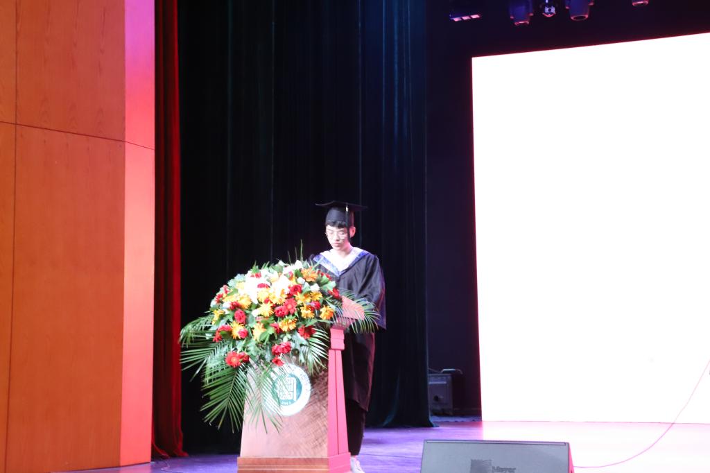 2021年考取南京师范大学硕士研究生刘然作为毕业生代表发言。他代表全体毕业生对母校的培养、学院的培育、老师的教诲、同窗的友谊表示感谢,他表示会带着老师们的期望和祝福,努力拼搏,不断进取,为母校争加光彩。2019至2020学年学校学风建设评选工作获得“先进宿舍”学生代表张志茹作为在校生代表发言。表达出了对学长学姐的不舍和祝愿,并感谢他们的帮助和照顾,表示以毕业生为榜样,用青春无悔实现大学的理想和诺言。
