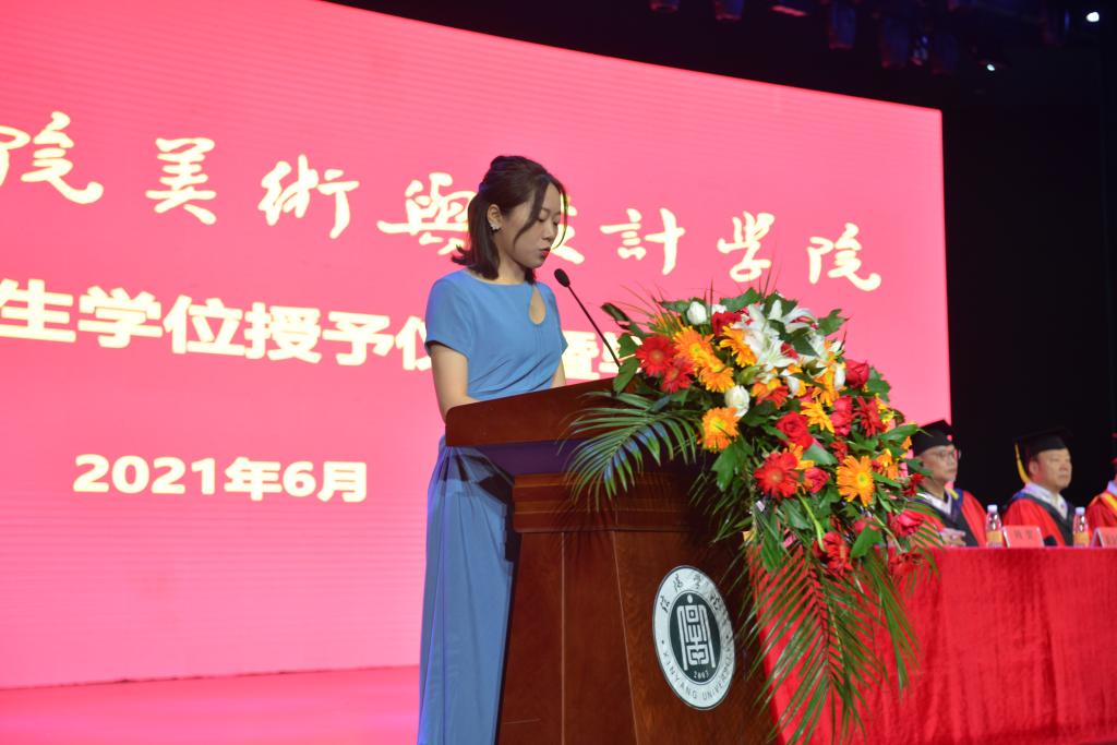 优秀青年教师代表、视觉传达教研室黄晨曦老师发言。她祝贺毕业生们顺利完成学业,期待毕业生们在不远的将来有所作为、有所成就。