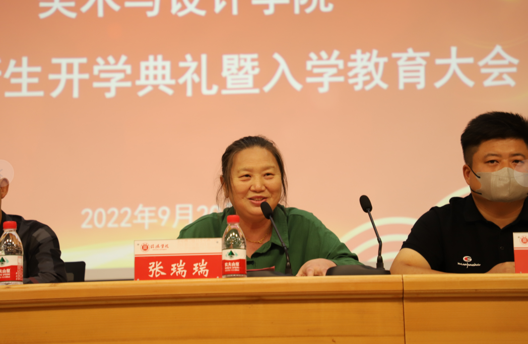 张瑞瑞院长致辞。她首先代表全院师生对新同学的到来表示热烈欢迎,向新生们介绍了美术与设计学院的发展历史、师资状况、科研实力以及人才培养等基本情况,并通过“责任”“自律”“规划”三个关键词对2022级新生表达了殷切期望。她指出,同学们进入大学,要知道对自己负责,对家人负责,对社会负责;要从被动管理向自我管理转变;要注意定好目标,找准方向,储备能量。她希望在未来四年的大学生活中,同学们能争做奋斗者,不负美好时代。