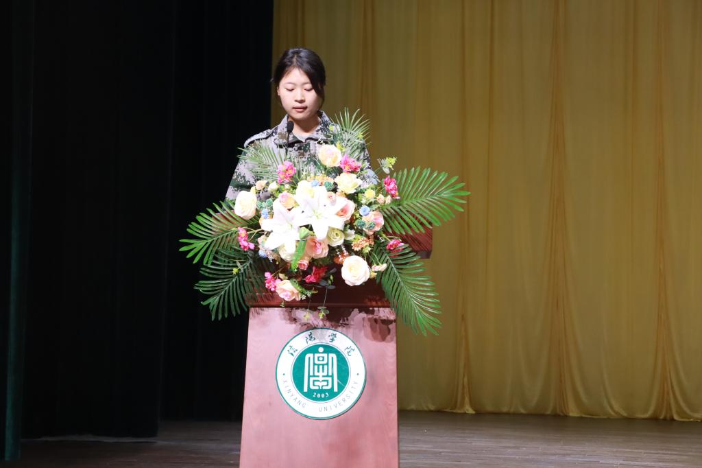 在校生代表2021级美术学本科6班的刘爱玲发言,向大家分享了在校的学习和成长感悟。新生代表2023级环境设计专业高蒙蒙发言,表示对即将开始的大学生活充满期待,对未来充满信心。