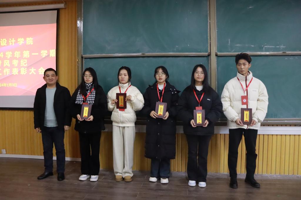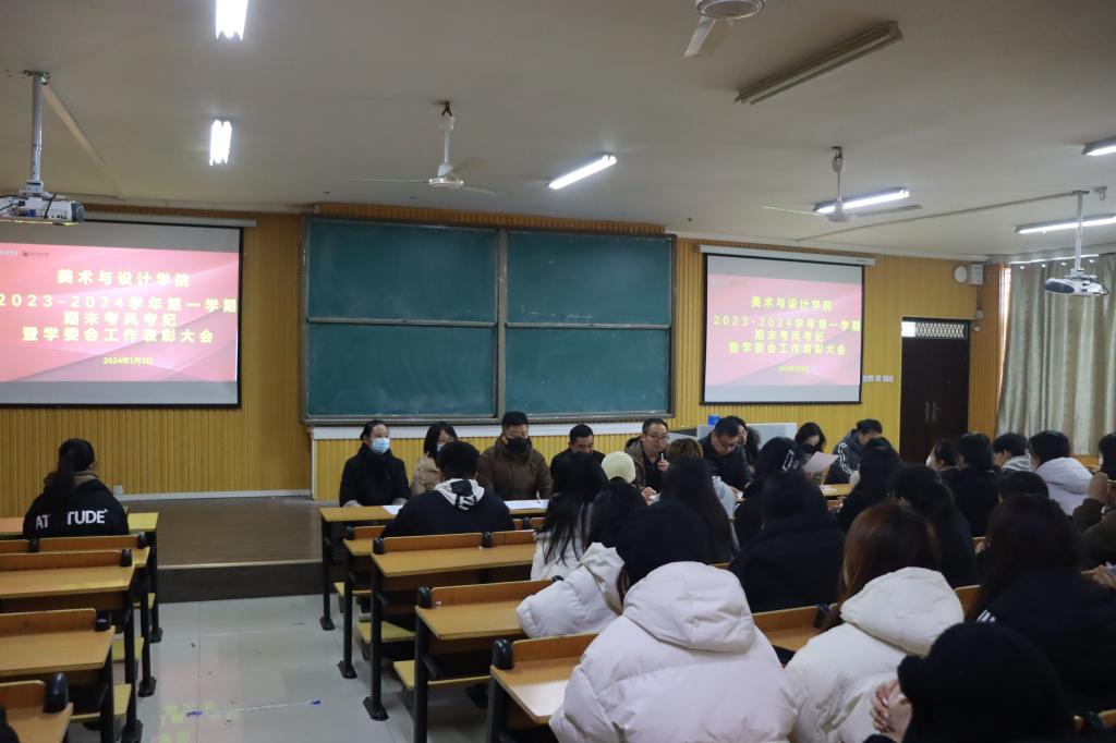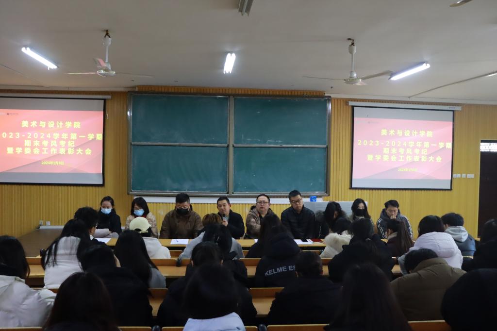 2024年1月3日上午,美术与设计学院在艺术楼101教室举行本学期期末考风考纪暨学委会工作表彰大会,学院书记袁军,教学副院长王伟,教学秘书周连峰,行政秘书李海丽,学工干事秦金峰,团总支书记齐阳阳,教务员王元元、唐静,教学资产管理员路凤云及200名学生代表参加会议。