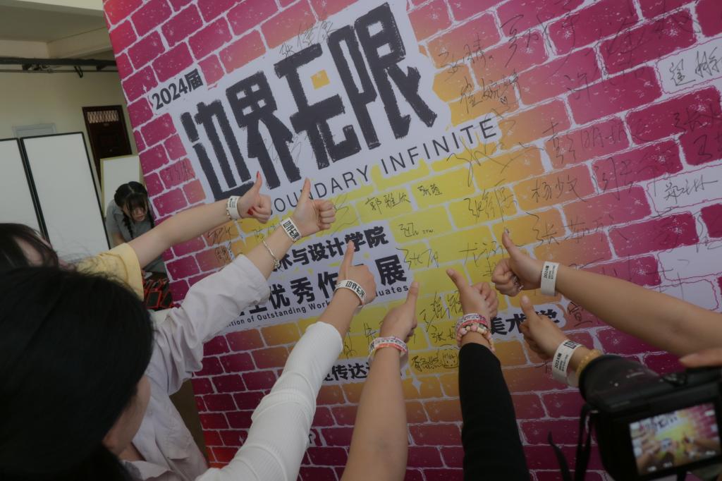 王强发表讲话。他对辛勤学习、即将学成毕业的同学们表示祝贺,向为学生们成长倾注心血的教师们致以慰问。他指出,在人工智能时代的浪潮下,美术与设计的发展应该思考如何将创意与智能科技相结合,开创新篇章。本次美术与设计学院“边界无限”毕业作品展正体现了这种思考。在这些作品里,有的同学通过研究民间艺术,挖掘传统文化内涵,用现代设计语言重新诠释;有的同学则关注社会问题,运用艺术作品提出解决方案,展现艺术的社会价值。每一份作品都是同学们对美学、对社会、对未来的独到见解和深思。他希望同学们能继续以开放的心态,拥抱变化,不断学习和探索,在人工智能时代,用美术与设计绘制出无限可能的未来。
