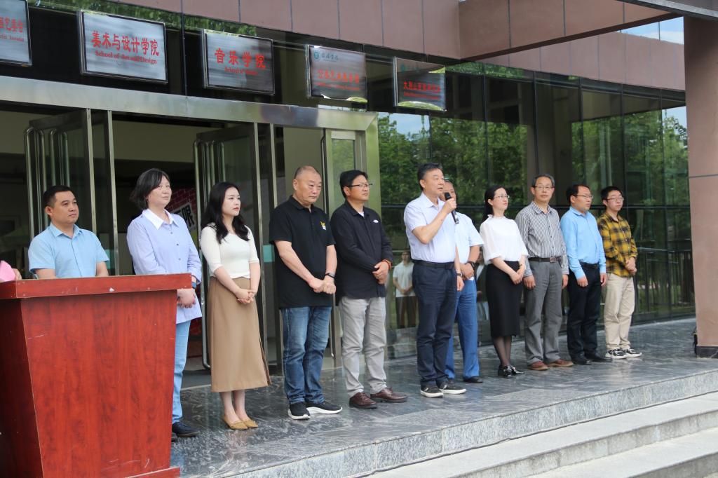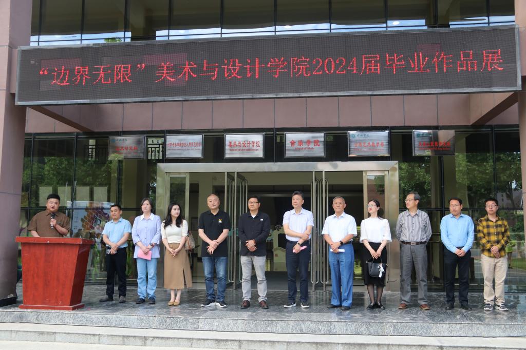 5月10日上午,“边界无限”美术与设计学院2024届毕业作品展开幕式在艺术楼前广场举行。副校长王志华、王强,特邀嘉宾国家一级美术师、河南省美术家协会理事李一冉,浉河区美术家协会主席、信阳油画艺委会主任刘松,友好合作单位代表信阳农林学院风景园林艺术学院视觉传达教研室负责人刘昂、羊山第三小学副校长陈莉,浉河区第一小学副校长祝亚玲等应邀出席了开幕式。社会科学学院名誉院长,团委书记郑山峰,社会科学学院副院长寇博文,美术与设计学院院长张瑞瑞、党总支书记袁军、教学副院长王伟,以及学院专家教授、指导教师和毕业生参加了开幕式。开幕式由王伟主持。