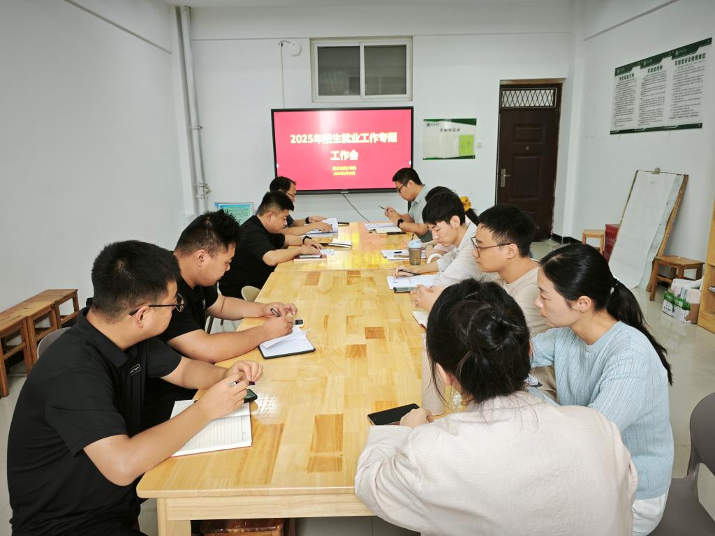 学工干事秦金峰对2025年线上招生直播、线下招生宣传工作和2025年毕业生就业工作进展情况进行了汇报,并领学了学校有关招生政策。