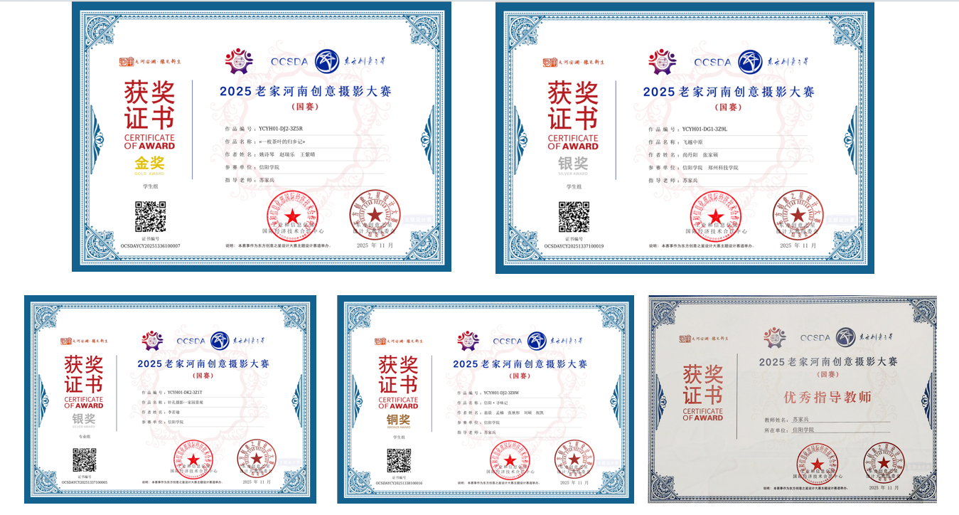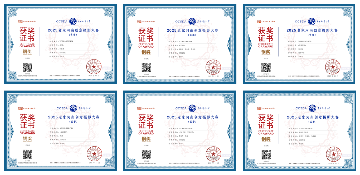 近日,东方创意之星—2025老家河南创意摄影大赛圆满落幕。美术与设计学院师生凭借扎实的摄影功底,以及独特的创意思维从众多参赛作品中脱颖而出,共获20余项大奖。其中,国赛金奖1项、银奖2项、铜奖1项、优秀指导教师1项,我校荣获优秀组织单位;省赛金奖5项、银奖6项、铜奖6项。