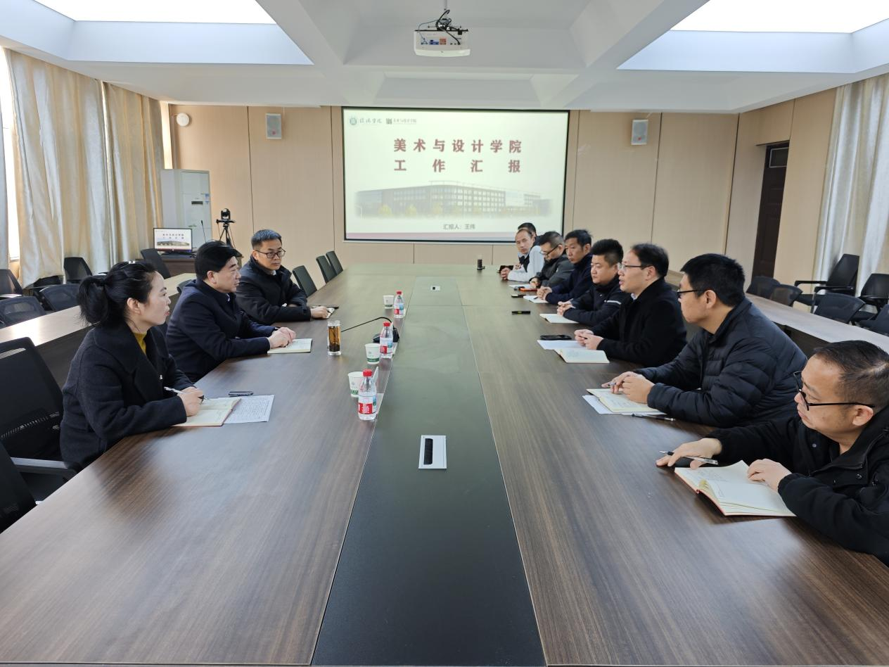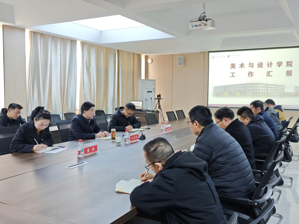 听取汇报后,江玉安作指导讲话。他要求,一是坚持党建引领促进事业高质量发展这一主线,把树立和践行正确政绩观学习教育作为当前学院工作的重心,与学院各项业务工作深度融合,着力提升党建引领效能;二是组建特色科研团队,打造科研平台,围绕美术与设计领域重点方向,有组织地开展科研,提升教师科研能力和水平;三是找准发展定位,坚持走出去与请进来相结合,对标先进,借鉴有关高校的发展经验,深化专业建设,做实产教融合,推动转型发展,不断提升学院内涵发展质量和办学影响力;四是坚守育人初心,落实立德树人根本任务,做好学生教育管理与服务,筑牢安全发展屏障,提升人才培养质量,增强学生就业竞争力,培养更多适应社会发展的高素质人才。