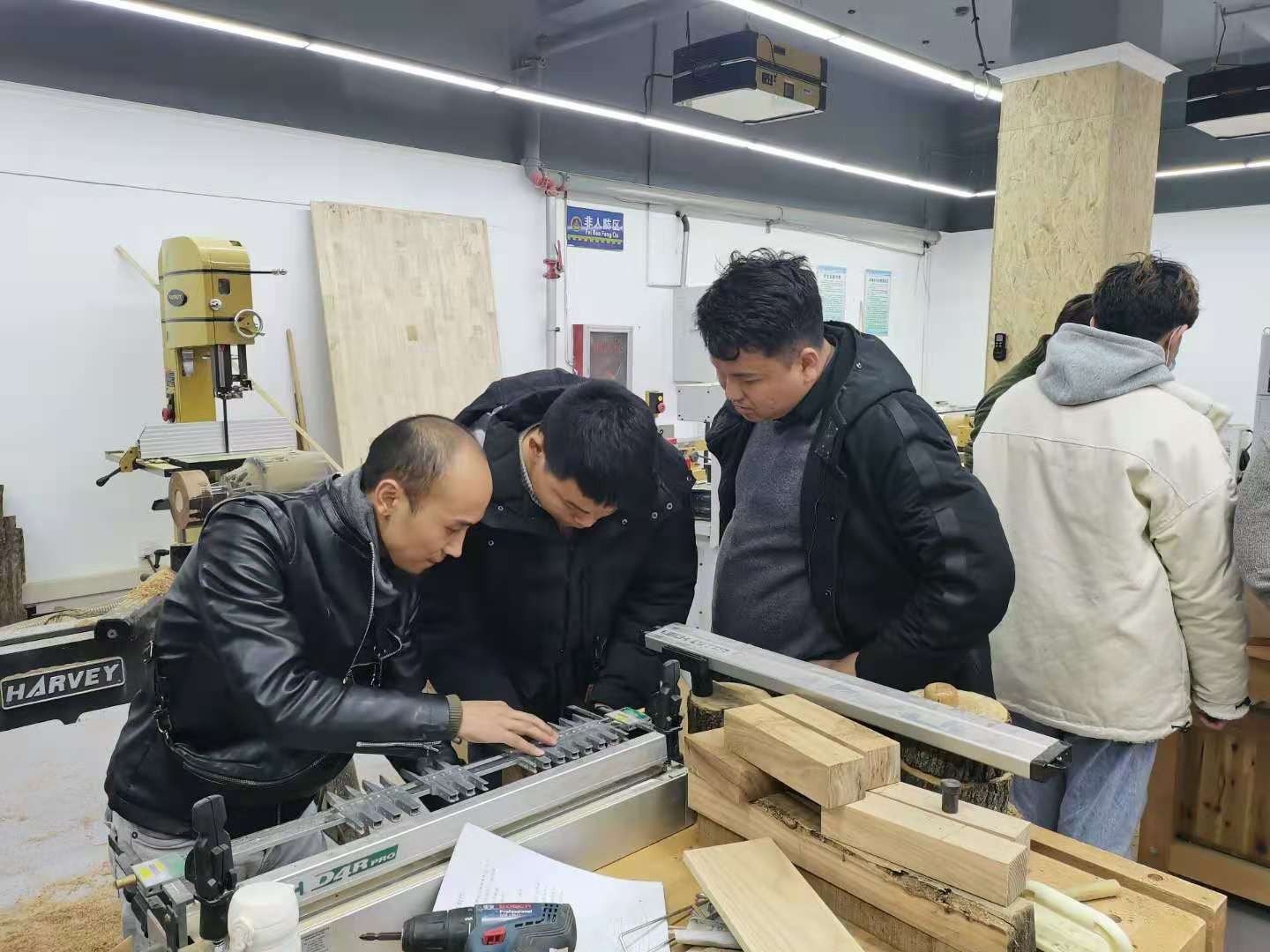曾学明非常注重木材的选用,对材质的品种、规格、等级、质量等都要进行严格把控。他告诉大家,使用木头不要急于切割,要先了解木头,观察木头纹理走向,做到物尽其用。过程中,师生们更加直观的明白了操作细节。曾学明亲自示范了推台锯,立铣设备的使用以及燕尾榫制作的培训等专业操作,并强调操作注意事项和要领,细心认真检查到位,遵守操作规则保护个人安全。最后,师生们围绕“专业性、系统性、参与性”几个方向与曾学明热情交流,更培养了学生在文创设计、家具设计、环艺设计等方面的创新创意能力,以及对工具使用的想象力以及空间想象力,使技术与艺术充分融合。