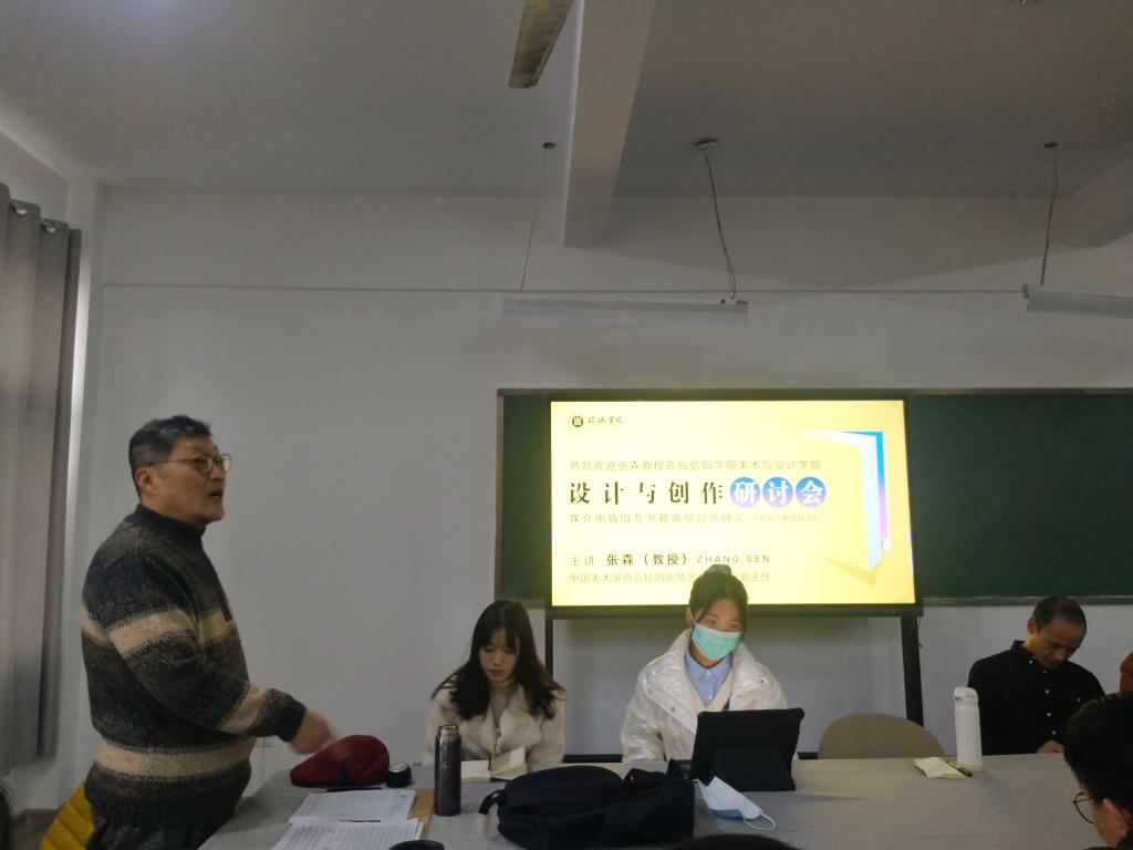 11月29日下午,美术与设计学院邀请中国美术家协会插图装帧艺委会副主任张森教授,在艺术楼408室开展“谈媒介中插图及书籍装帧创作研究”为主题的学术报告活动。学院院长张瑞瑞、党总支副书记袁军、学工干事周扬,美术学、视觉传达设计、数字媒体设计等教研室的相关教师,学院相关专业的学生代表近50人参加了本次学术报告活动。学术汇报由张瑞瑞主持。