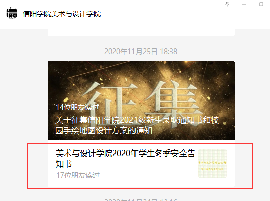 活动期间,学院围绕宿舍安全、交通安全、财产安全、饮食卫生安全、疫情防控等内容,拟定了《美术与设计学院2020年学生冬季安全告知书》,并发布在学院官网学风建设专栏,同时在微信公众号发布后,各年级班级班长、生活委员纷纷将安全告知书转发至班级的微信群、QQ群,以此让我院全体学生学习和了解学生安全告知书的内容和安全防范注意事项,做好学生冬季安全线上教育工作。在低年级学生课堂开展的“课前十分钟”环节、在学院德育导师课上,我院教师宣读和传达了学生安全告知书,进一步夯实学生冬季安全教育工作。