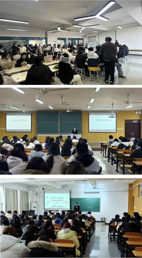 各班级通过召开主题班会、组织签署《诚信考试承诺书》等多种形式,全方位推进诚信教育。班会上,辅导员老师们以真实的作弊案例为切入点,深入剖析了考试违纪的严重后果。老师们不仅详细解读了考场注意事项及相关纪律规定,明确划出了不可触碰的“红线”,还重点强调了诚信考试对于个人品德塑造的重要性。同时,辅导员们结合实际,向同学们详细讲解了违纪处分对后续升学、求职生涯的深远负面影响,以此警醒大家务必严守纪律,诚信作答。